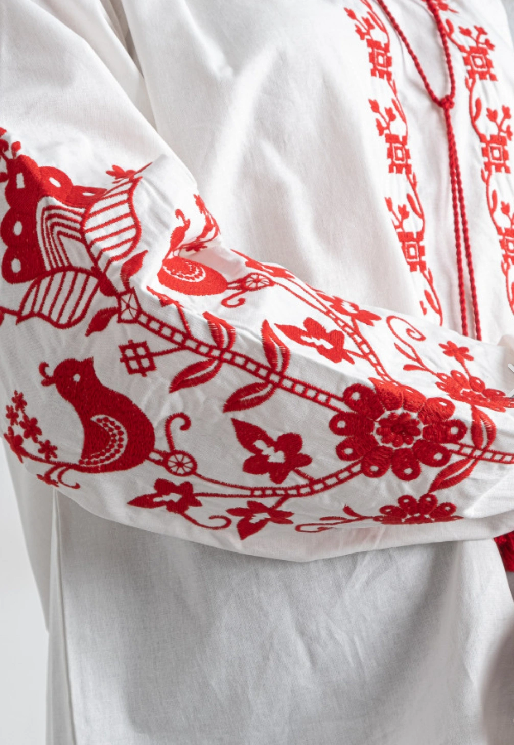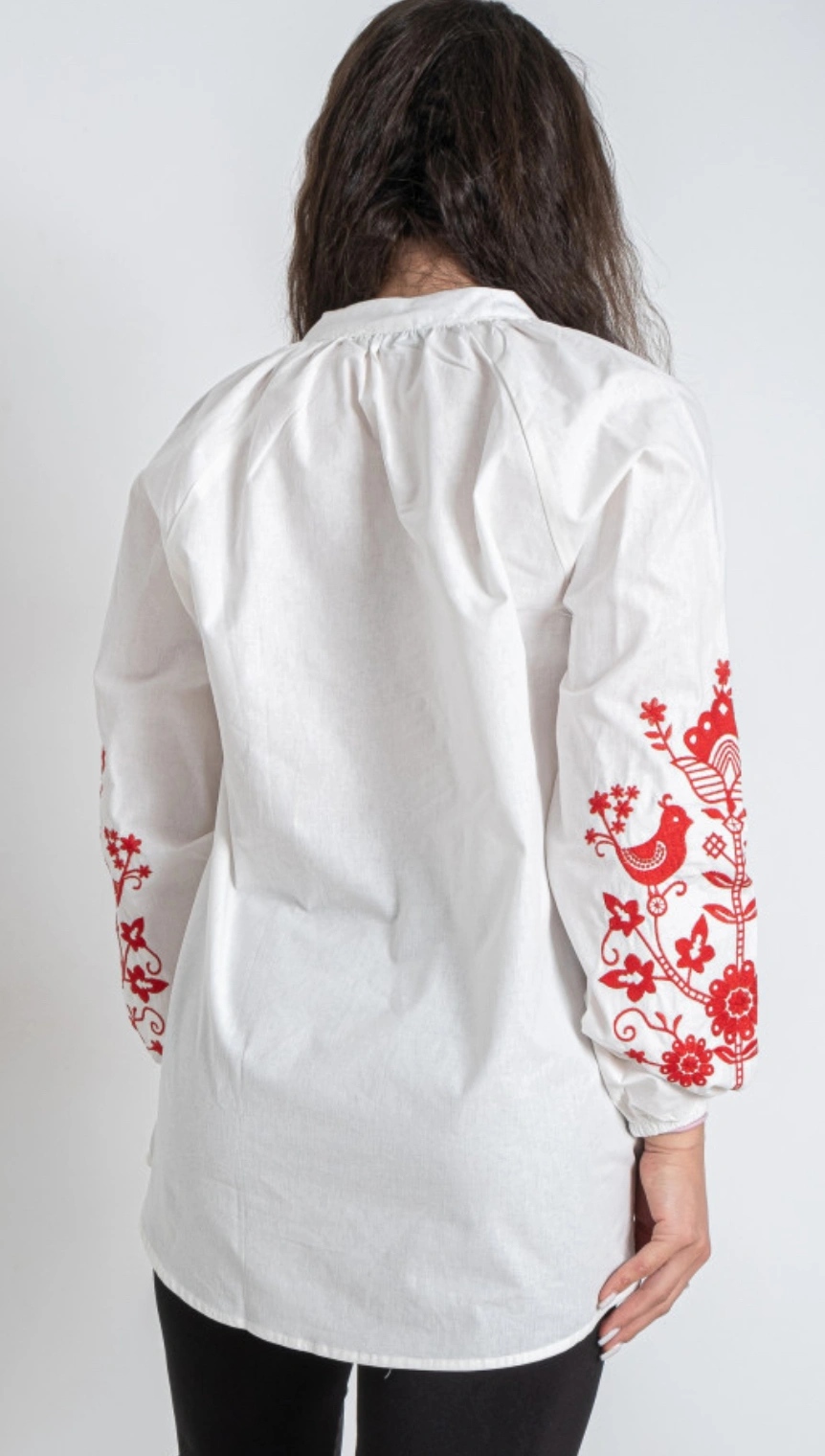 El işçiliği kırmızı işlemeleriyle öne çıkan bu beyaz bohem bluz, hem zarif hem de rahat bir stil sunar. Pamuklu kumaşıyla gün boyu konfor sağlar. Etnik motiflerle süslenmiş kolları ve ipli yaka detayı, boho tarzını sevenler için mükemmel bir seçimdir. Jean, etek veya keten pantolonlarla kolayca kombinlenebilir. Günlük kullanımda veya özel davetlerde doğal şıklığı yakalayın.