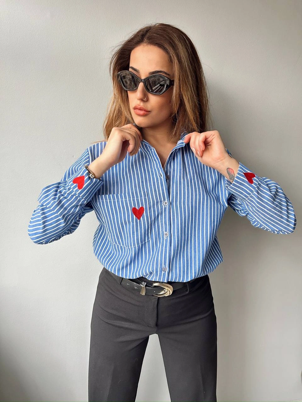 İster jean ister keten pantolonla kombinleyin, kalp nakışlı gömlek modern şehir stilinin tamamlayıcısıdır.