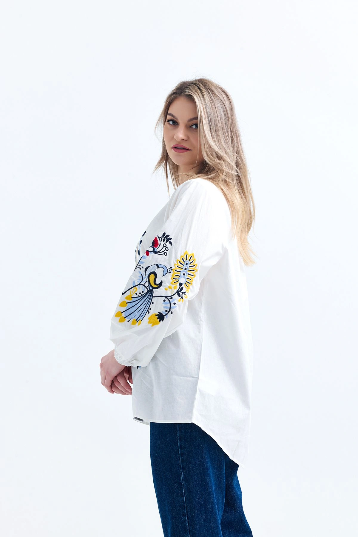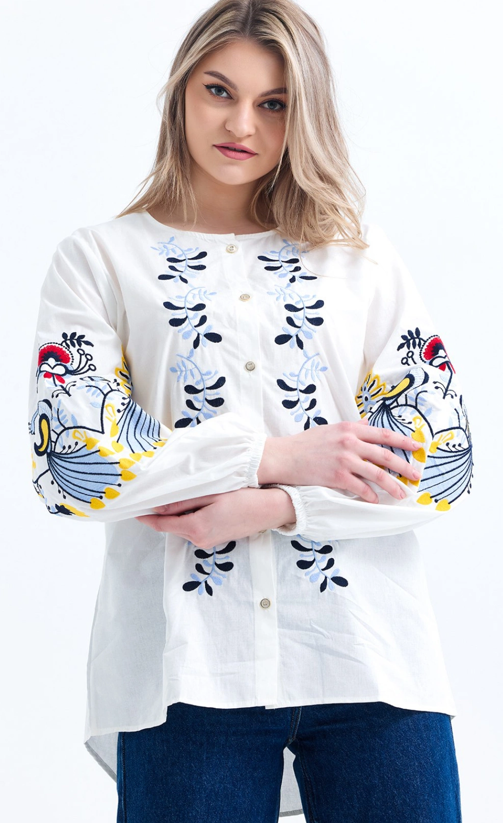 Renkli Kol Nakışlı Keten Kadın Gömlek – Etnik Desenli Bohem Düğmeli Model